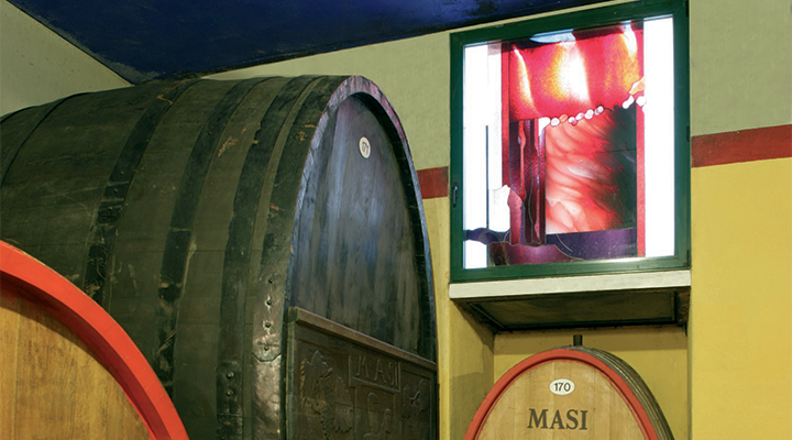 Le vetrate artistiche in vetro soffiato con il loro design astratto richiamano i colori e l’effervescenza del vino. Lo stile moderno delle vetrate pur contrapponendosi allo stile classico della cantina crea un ambiente armonico e vivace.