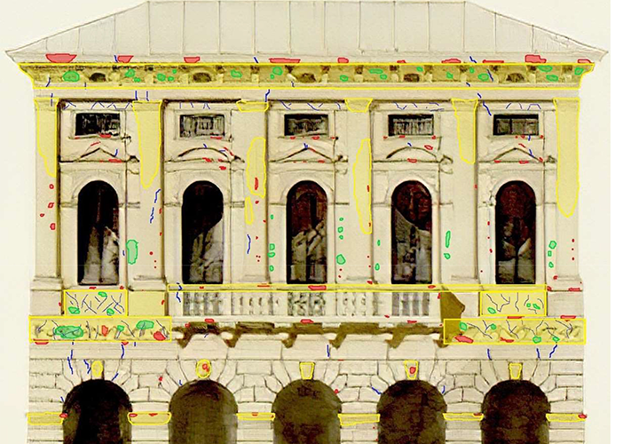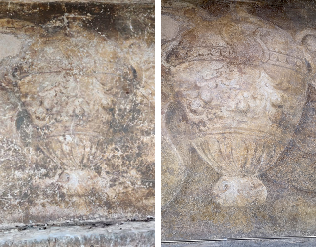 Dettaglio di una parte affrescata della facciata prima e dopo il restauro.