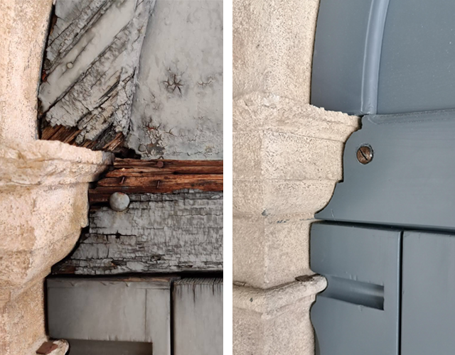 Dettaglio di un infisso ligneo prima e dopo il restauro.