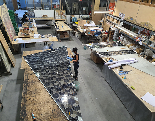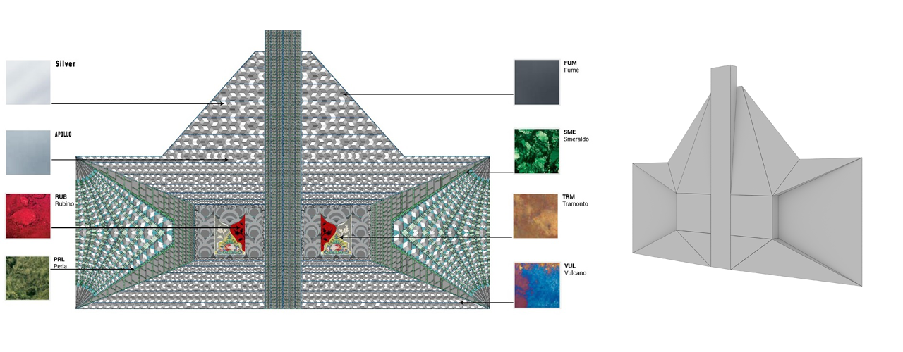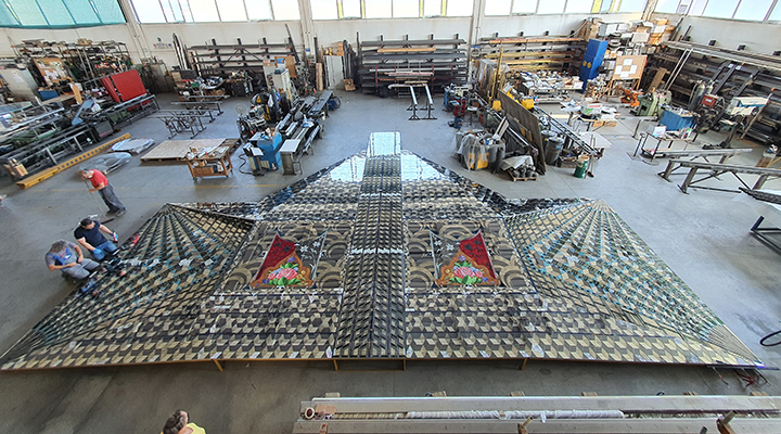 Nella fase di progettazione vengono studiati non solo gli aspetti artistici ma anche i particolari tecnici. Per realizzare questa parete tridimensionale di notevoli dimensioni (m 12,58×8,84h), il disegno geometrico è stato valutato nel minimo dettaglio per evitare la rottura di vetri in prossimità degli spigoli.