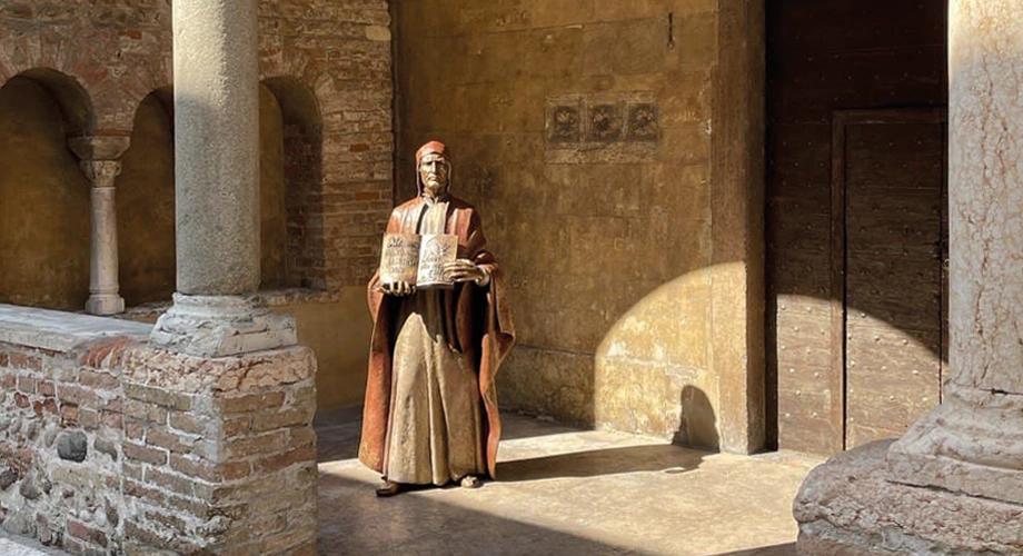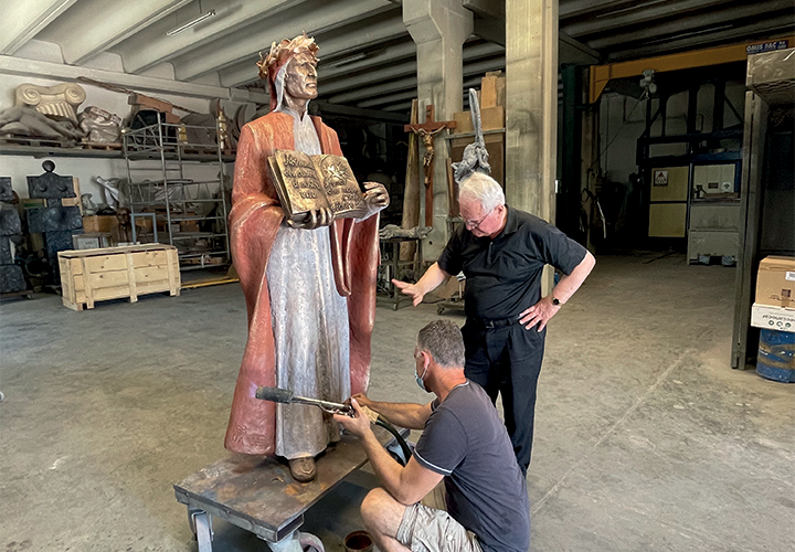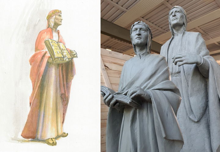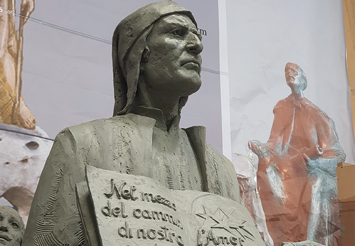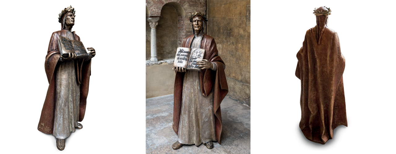 La nuova statua di Dante è realizzata secondo l’iconografia che la storia dell’arte ci ha insegnato da Giotto, suo contemporaneo, in poi. Alcune caratteristiche la rendono tuttavia unica, frutto del dialogo con la committenza che ha voluto donare alla città un’opera che potesse rivolgersi all’osservatore in modo quasi diretto, apparendo così per dire “viva”. Un effetto che abbiamo ottenuto con una speciale finitura realizzata con patine artistiche colorate, che valorizzano il bronzo e la sua matericità.