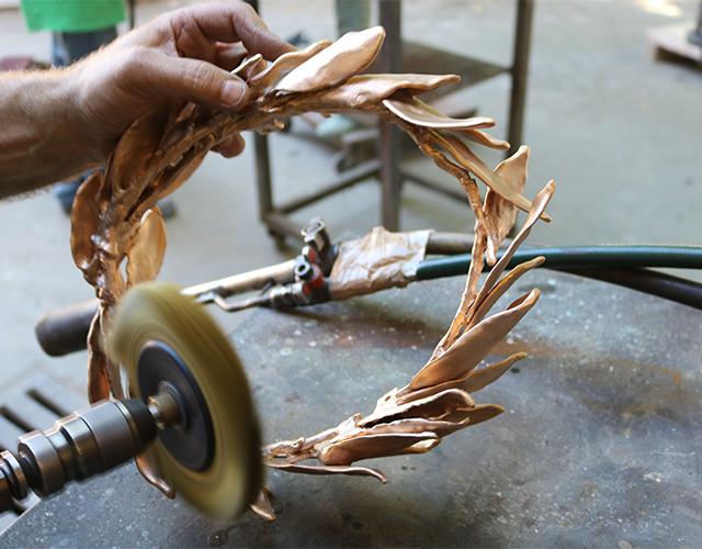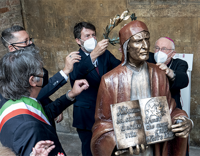La corona del Poeta è stata realizzata mediante una fusione separata, con colatura diretta del bronzo su veri rami e foglio di alloro. Una scelta ha consentito di inaugurare l’opera coronandola con un gesto reale, dando corpo e realtà all’immaginario del Poeta coronato d’alloro. La corona e il gesto della coronazione assumono così un significato profondamento simbolico, segno dell’ammirazione che noi uomini di questo tempo proviamo per Dante e per la sua opera.