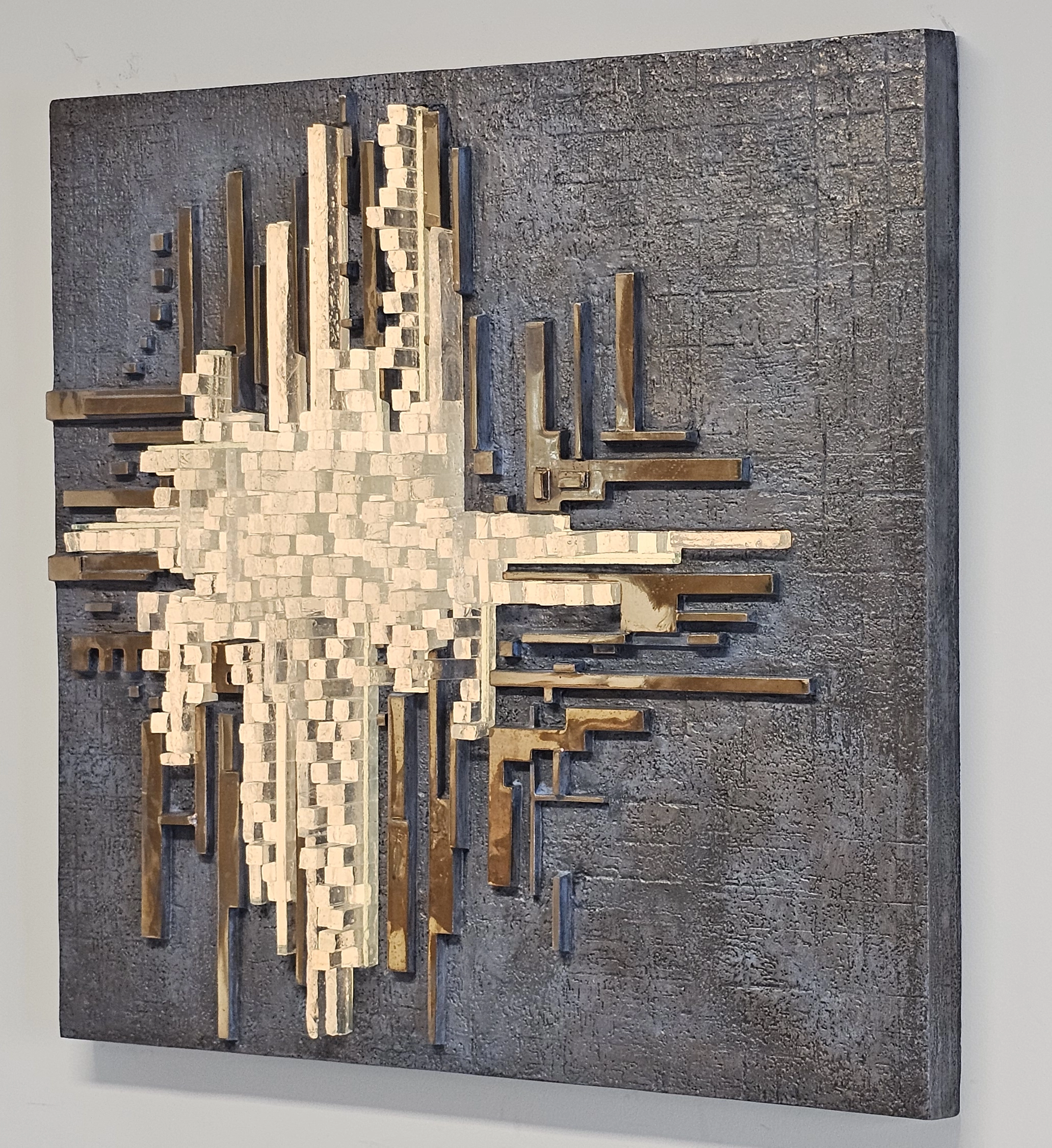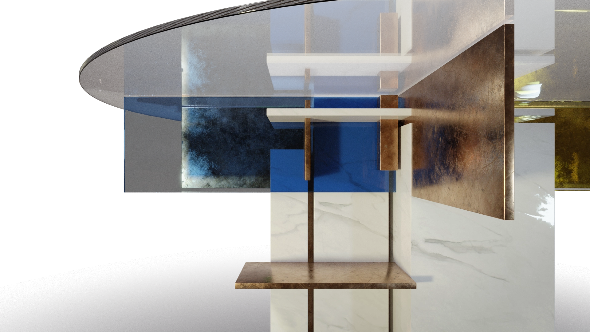 Una composizione libera di piani e superfici, dove la materia produce spazialità per mezzo del movimento.