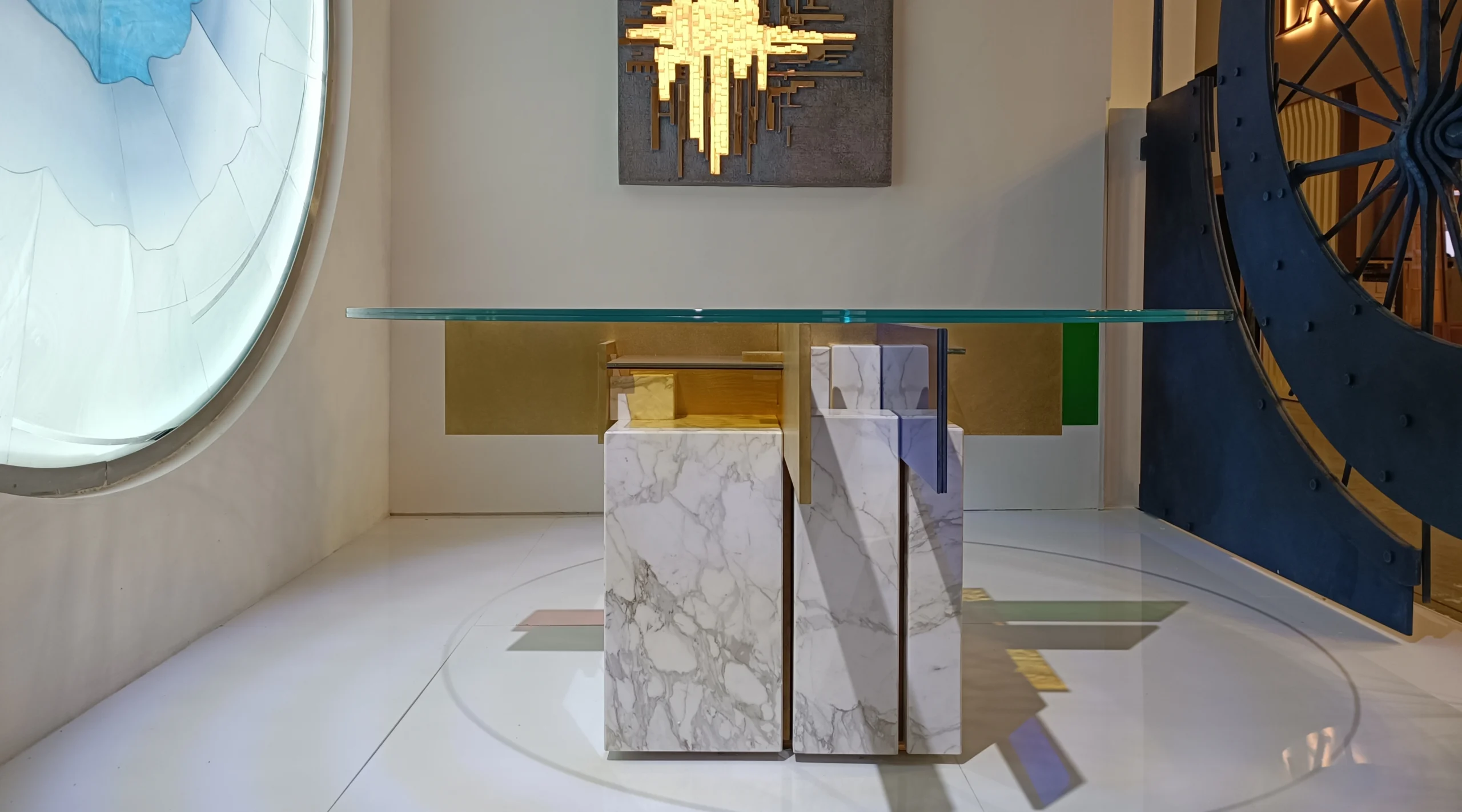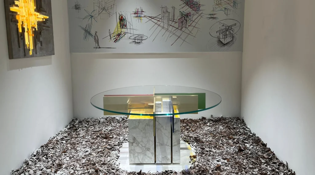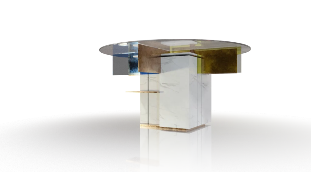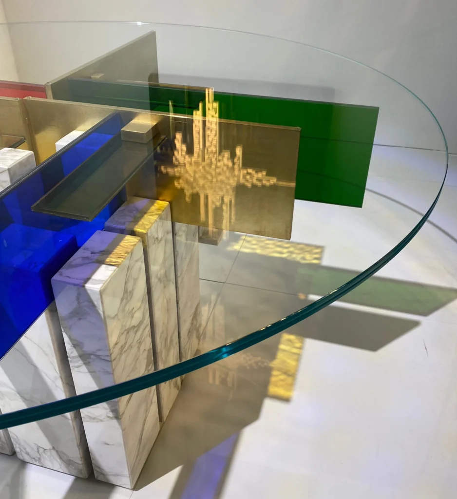 Il tavolo, scomposto e asimmetrico, ma al contempo figlio di un certo razionalismo e astrattismo geometrico, unisce arte e design