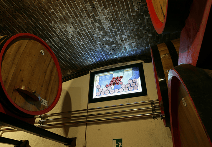 The mouth blown glass windows with their abstract design recall the colours and the effervescence of wine. The modern style of the windows while contrasting with the classic style of the cella creates a harmonious and lively environment.
